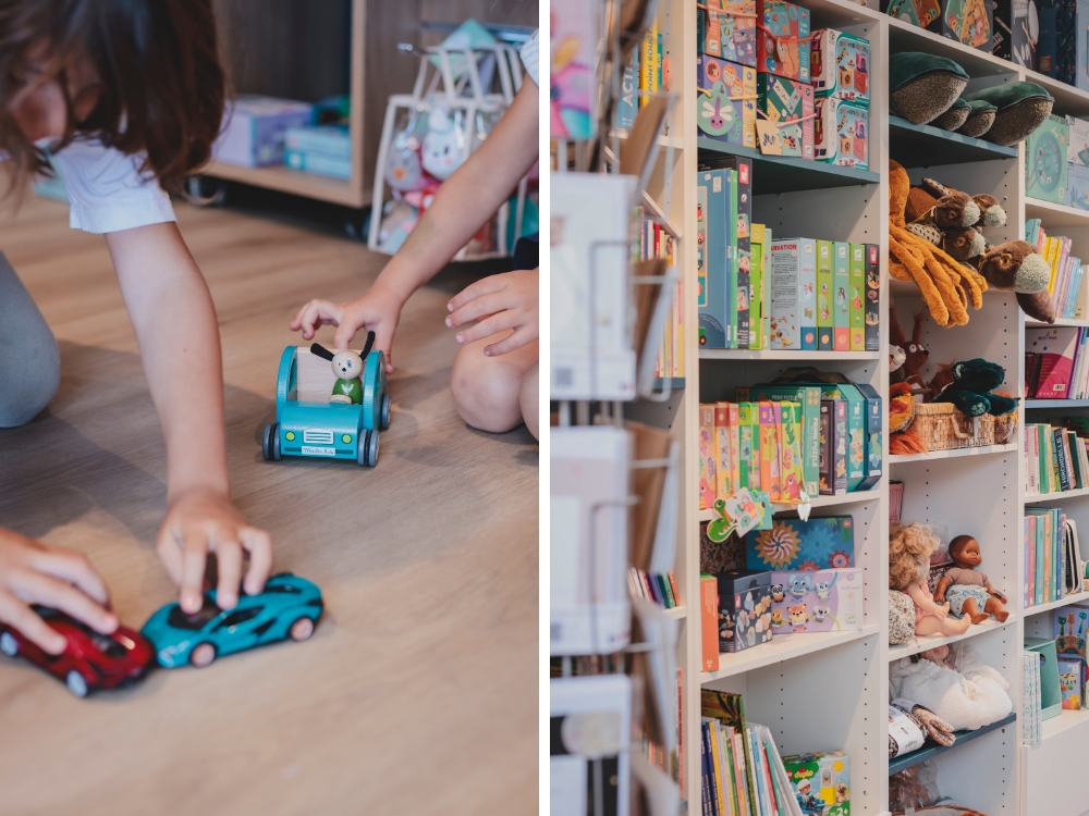 L'Ecureuil Bleu heeft ook een assortiment speelgoed en spelletjes, creatieve hobby's en schrijfwaren.