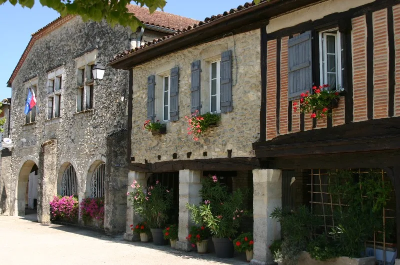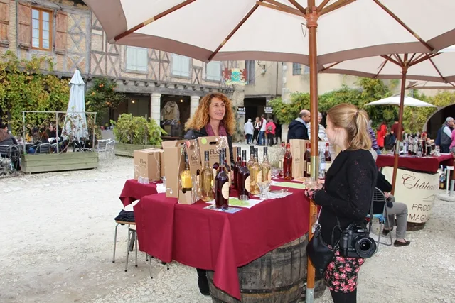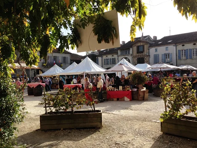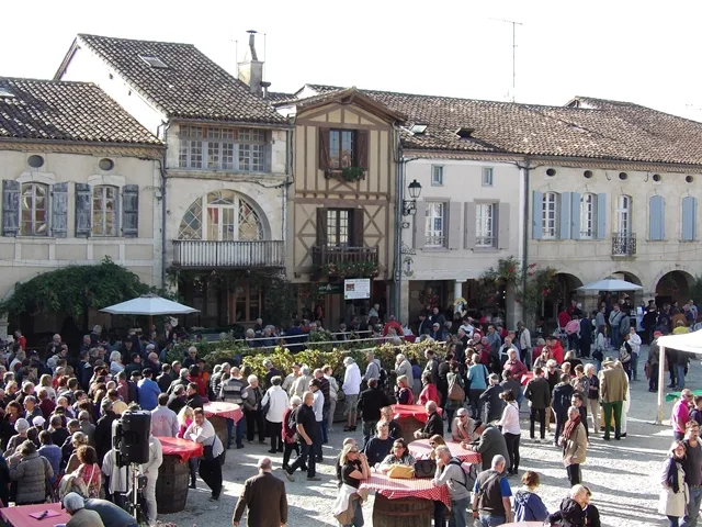 Ci dessous La Place Royale de Labastide d’Armagnac pendant “Armagnac en Fête”