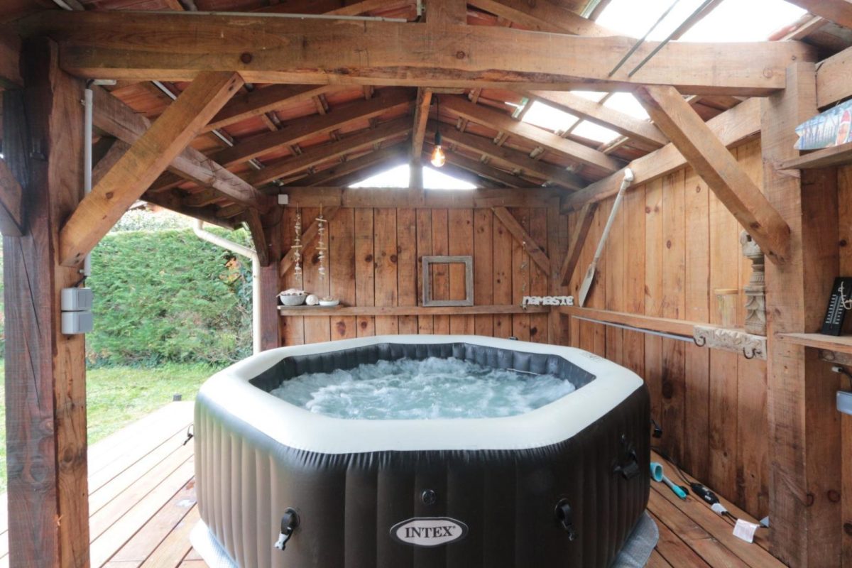 Je zult dol zijn op het mooie houten terras, gedeeltelijk overdekt door een afdak, waar je in elk seizoen buiten kunt eten (tuinmeubels van exotisch hout, barbecue, ligstoelen). Op zonnige dagen kun je ook genieten van een privé Intex opblaasbare jacuzzi beschut door een luifel, met uitzicht over de onoverdekte beboste tuin.