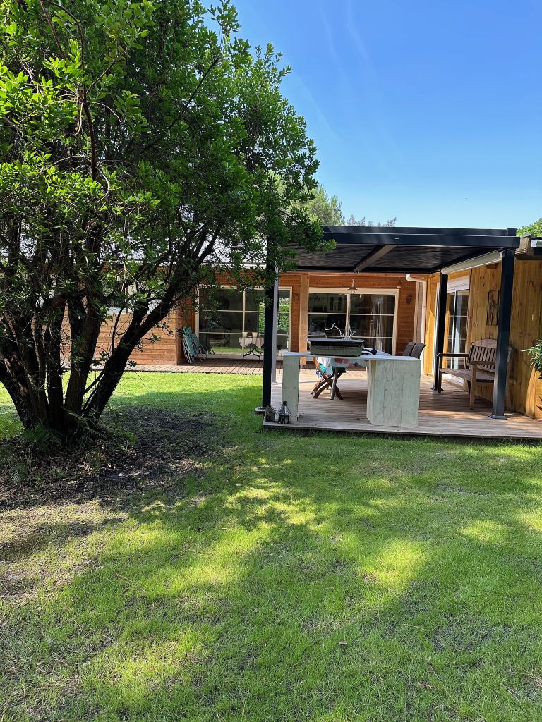 Deze mooie houten villa, sierra voor puristen die rust en sereniteit zoeken, om een vakantie als geen ander te bieden. zijn ligging in de rust, dicht bij het bos, vlakbij het fietspad, zijn plantenhekken, zijn beboste tuin en zijn poort zullen de vakantiegangers toelaten om goed geïsoleerd te zijn, om zich thuis en veilig te voelen. U zult de schoonheid van deze camping, zijn grote tuin met bomen en zijn ruime terrein waarderen. Tijdens uw dutjes, op uw ligstoelen die u naar wens in de tuin kunt schikken, onder een boom of in de zon, zult u alleen de vogels horen zingen. Uw kinderen zullen mooie momenten kunnen delen op deze groene plek, half in de schaduw, half in de zon. Op het overdekte terras kunt u ontbijten en eten, zelfs bij grijs weer. Het sobere en kleurrijke interieur behoudt overdag de frisheid dankzij het dakoverstek.