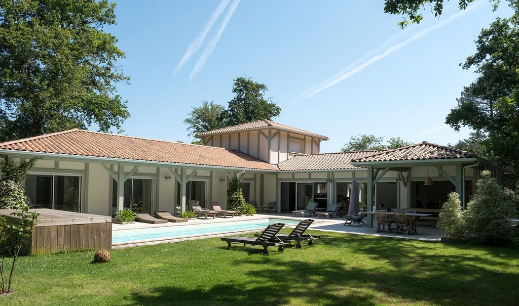 Maâ Maison, 220 m² volledig geklimatiseerd, biedt een uitzonderlijk comfort. Een woonkamer van meer dan 60 m² met 8 m erkers met uitzicht op het zwembad.