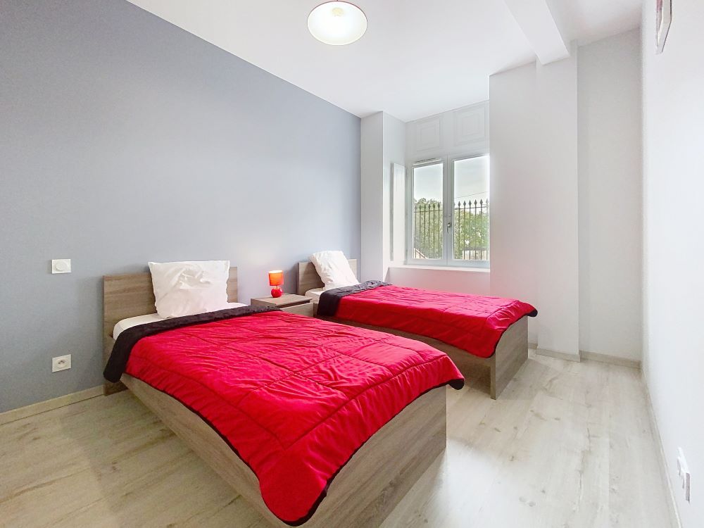Het appartement heeft 2 slaapkamers: een met een tweepersoonsbed (140cm) en een met twee eenpersoonsbedden (90cm); badkamer met douche.