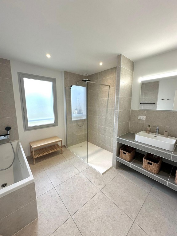 - Badkamer met douche en bad