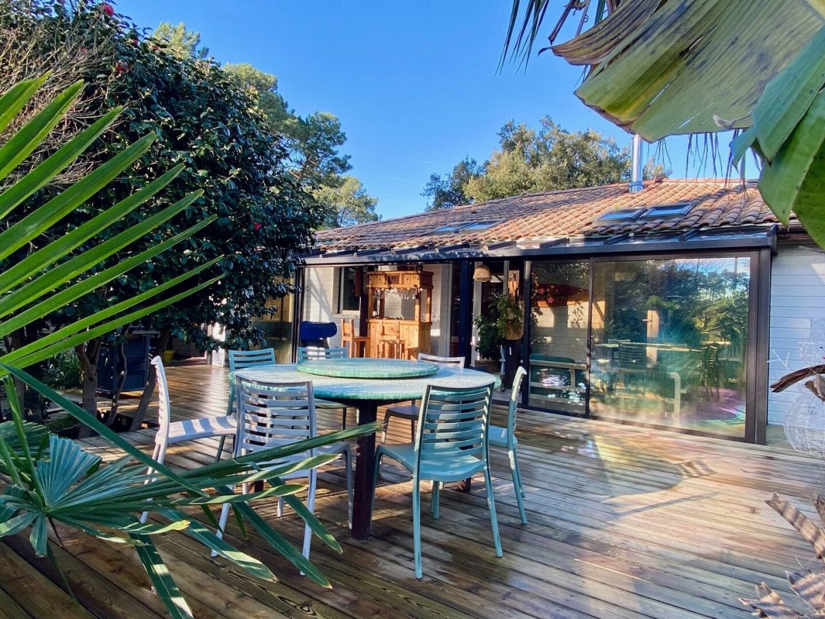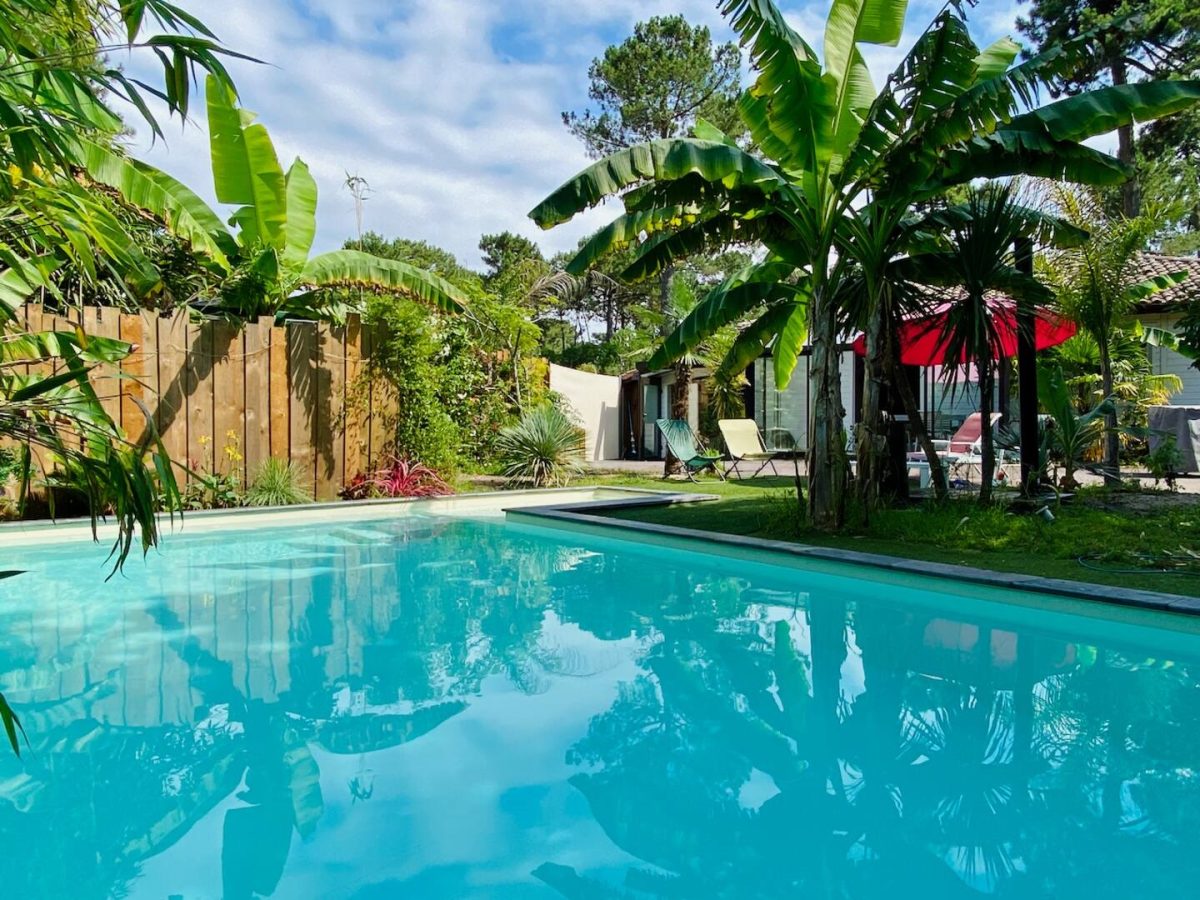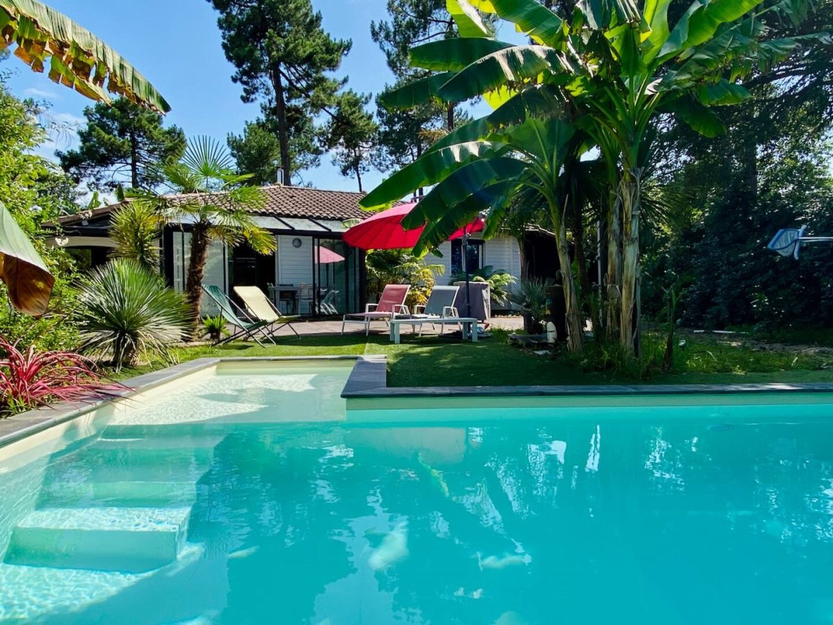 Volledig gerenoveerde Landaise villa met airconditioning en verwarmd 8x4 zwembad met strand, omringd door een exotische tuin met bomen.