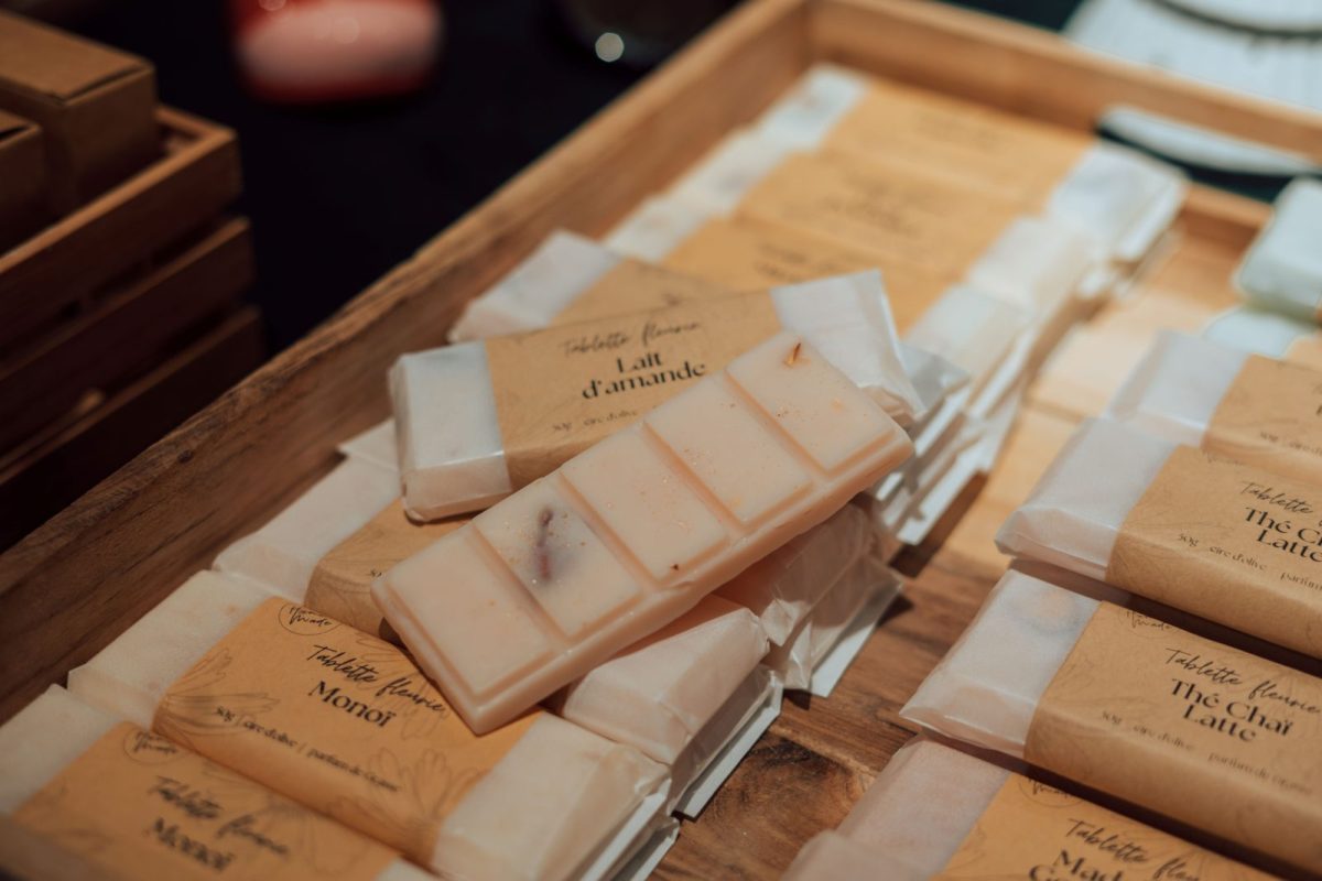 100% sojawas, biologisch afbreekbaar. Onbehandelde houten lont die knispert. Lokale gedroogde bloemen. Herbruikbare verpakkingen. Handgemaakt in de Landes.