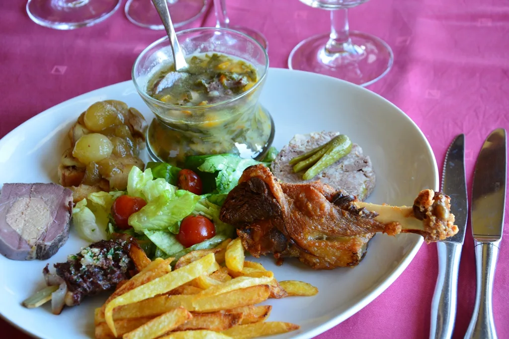 Ici, on me propose l’Assiette de Pays « saveur de Chalosse » à 25€ avec une garbure maison, un pâté de porc maison, du foie gras frais aux raisins, un manchon de canard, du magret froid fourré au foie gras et des pommes frites pour l’accompagnement. Pour le dessert ce sera une mousse au miel et pour la boisson, un verre de rouge de la cave des vignerons landais du Tursan !