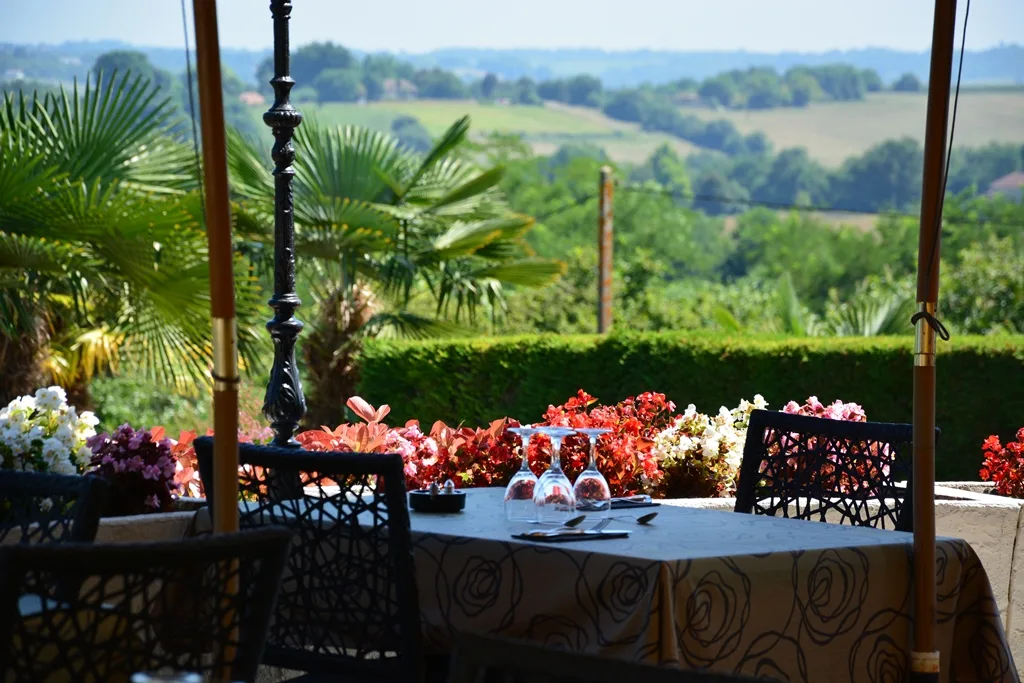 Un petit creux ? Direction le restaurant Aux Tauzins qui m’a été conseillé à plusieurs reprises ! En observant la devanture, je suis loin de me douter du cadre magnifique, des jardins et de la vue qui se cachent derrière !