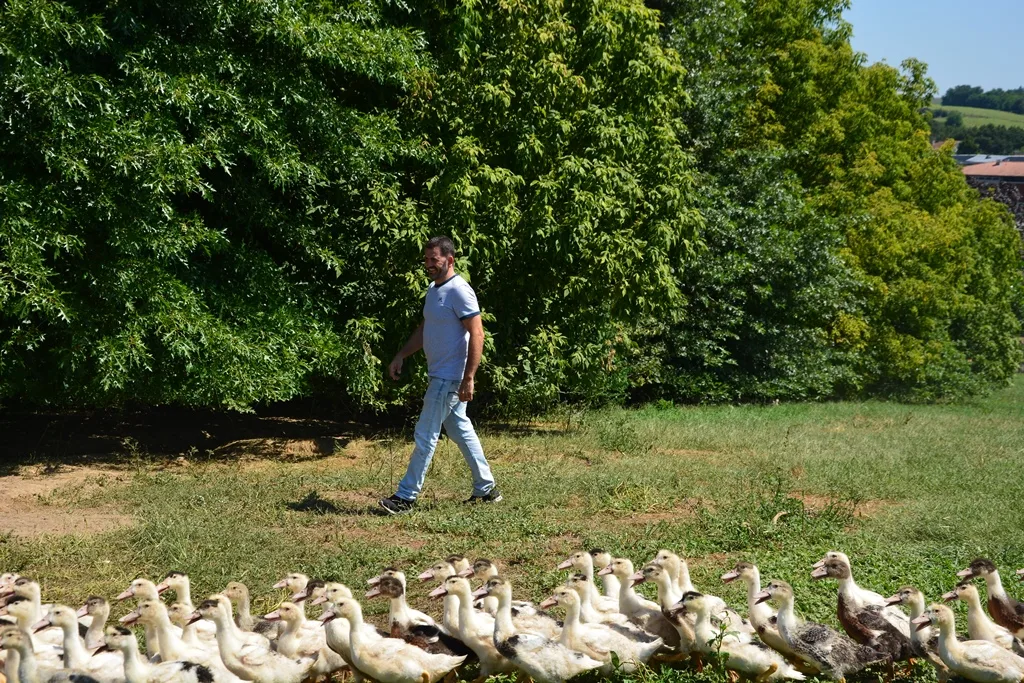 Joël m’explique qu’en plus de l’élevage, la ferme se consacre à la polyculture : maïs, tournesol, colza, blé… ce qui permet de nourrir les canards. En fonctionnant en « circuit fermé », le producteur a l’assurance de la qualité de ses canards. Ils sont aussi élevés en plein air et changent régulièrement de parcelles pour pouvoir se nourrir d’herbes fraîches. Au fil de notre conversation, je comprends que ces animaux sont élevés avec amour et respect.