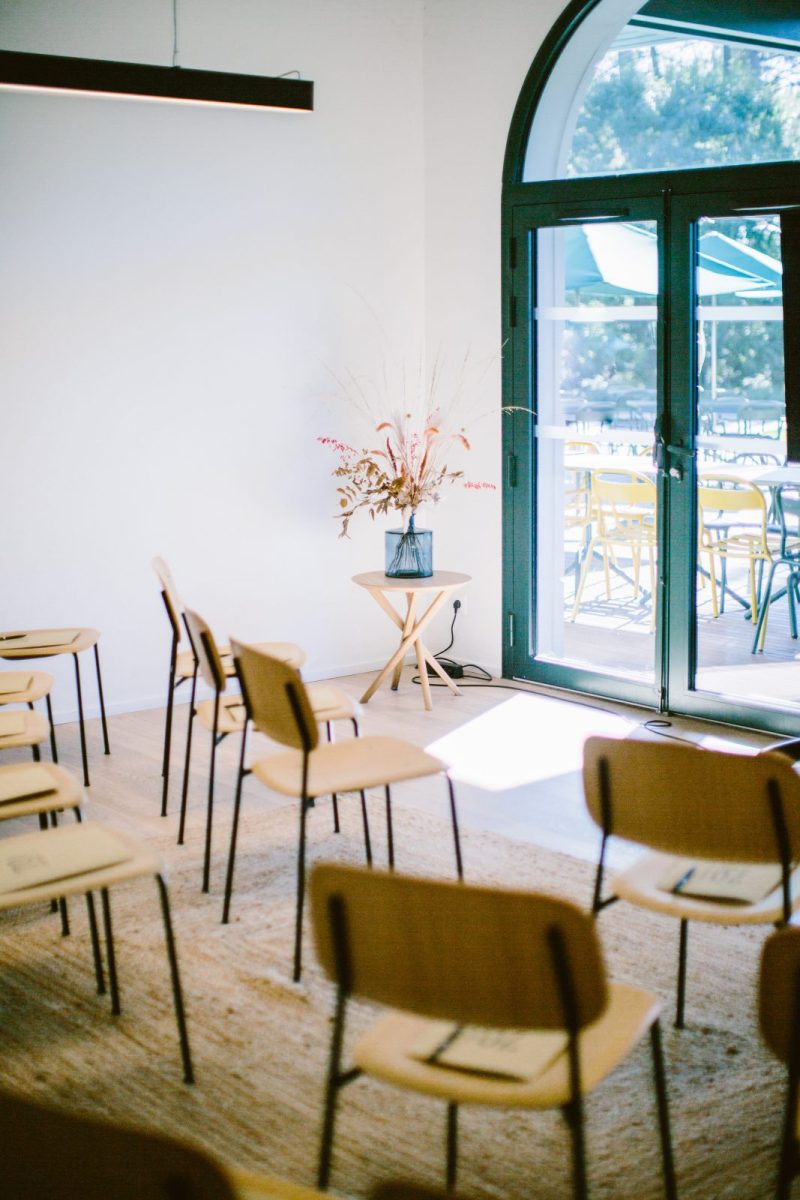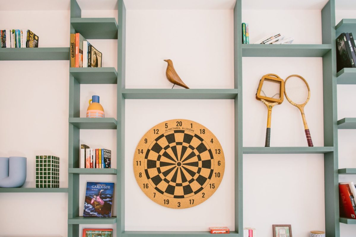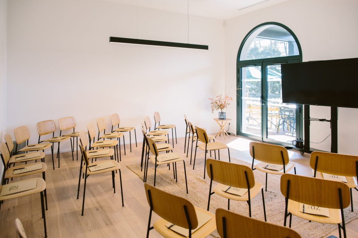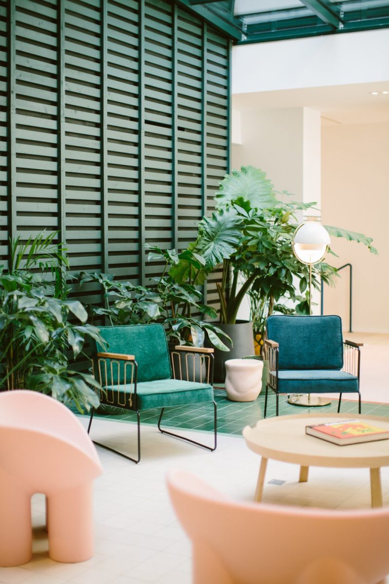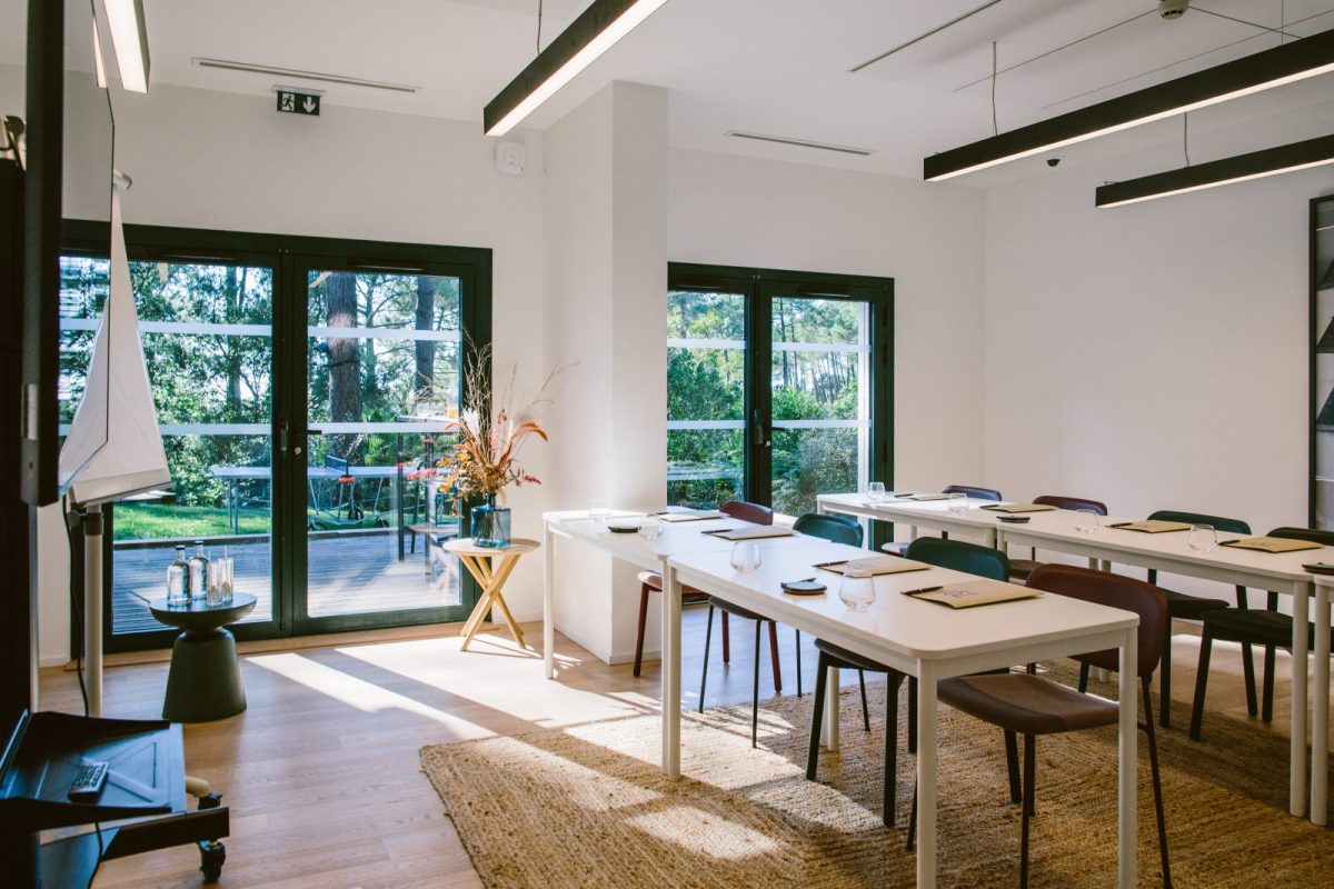 L’intérieur offre une décoration résolument graphique : l’ensemble crée un décor gai, ludique, qui joue - avec distance - les codes des sports locaux. Les vastes espaces du rez-de-chaussée accueillent salons, bar et salles de séminaire.