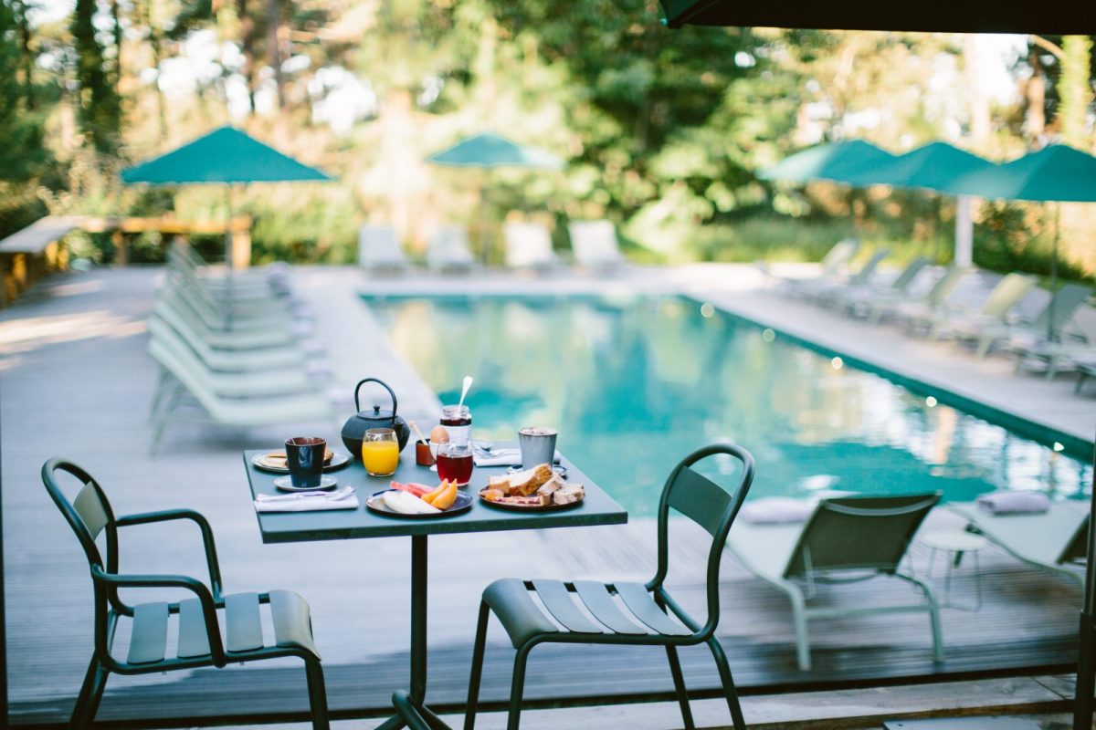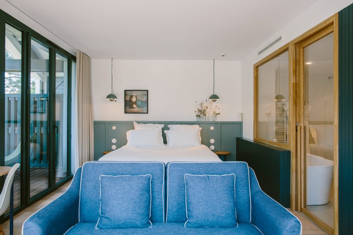 Chacune de ses 32 chambres et suites s'ouvre par de larges baies vitrées sur la cime des pins.